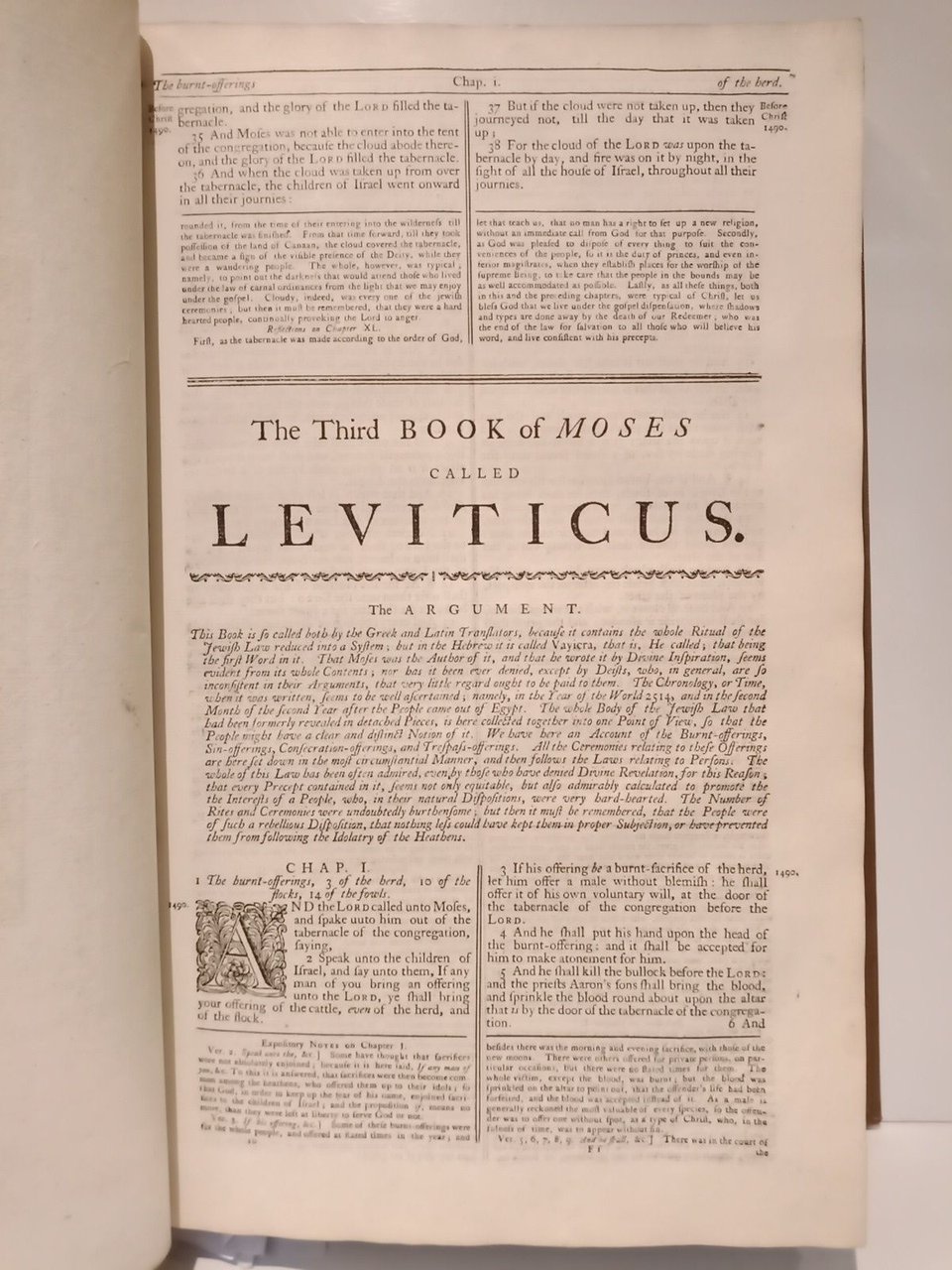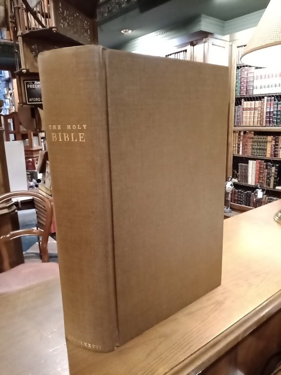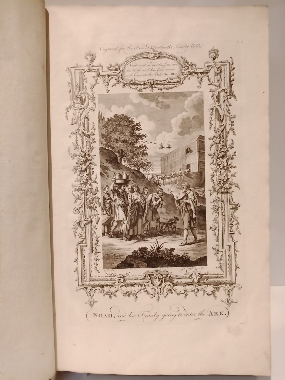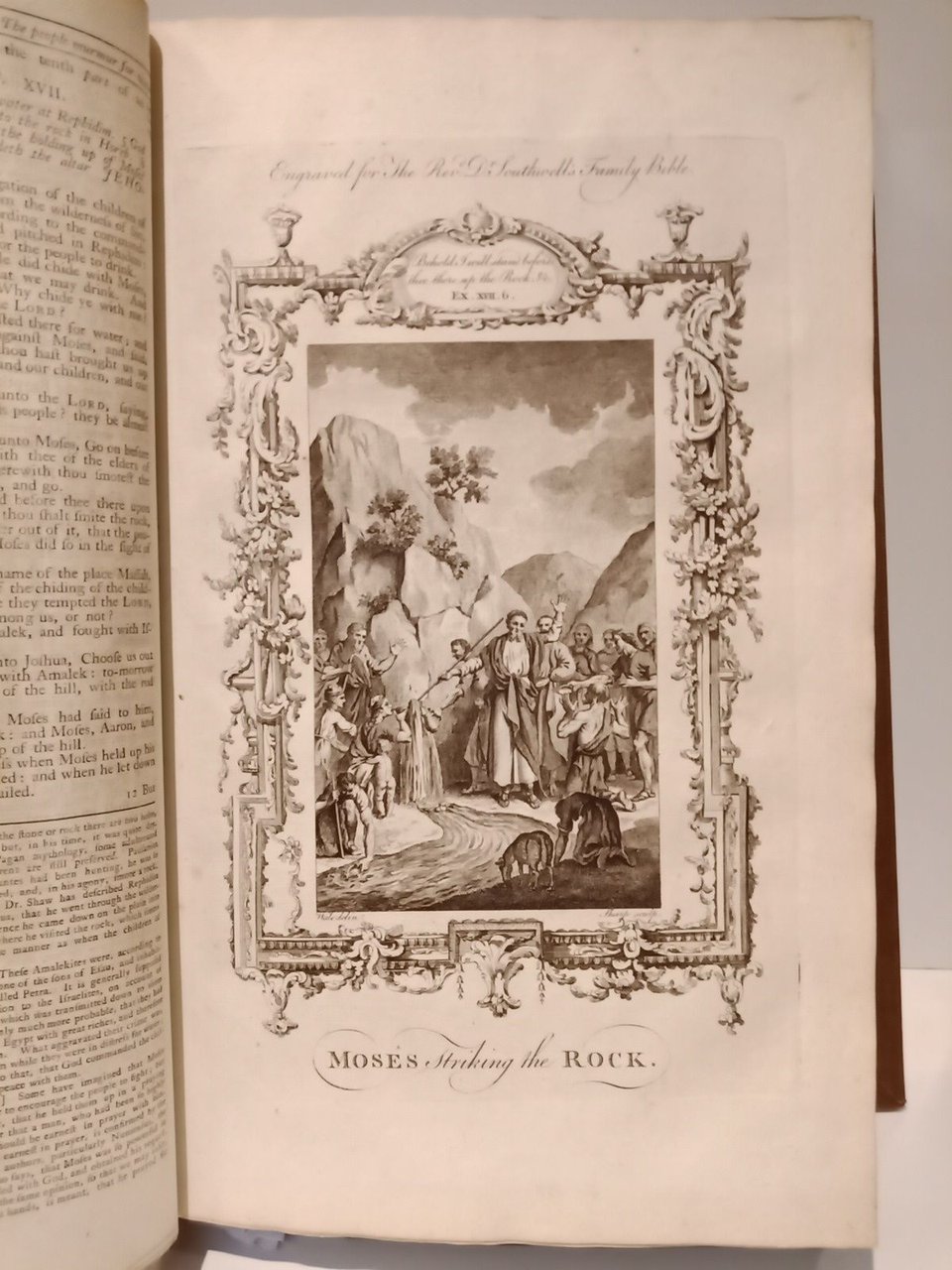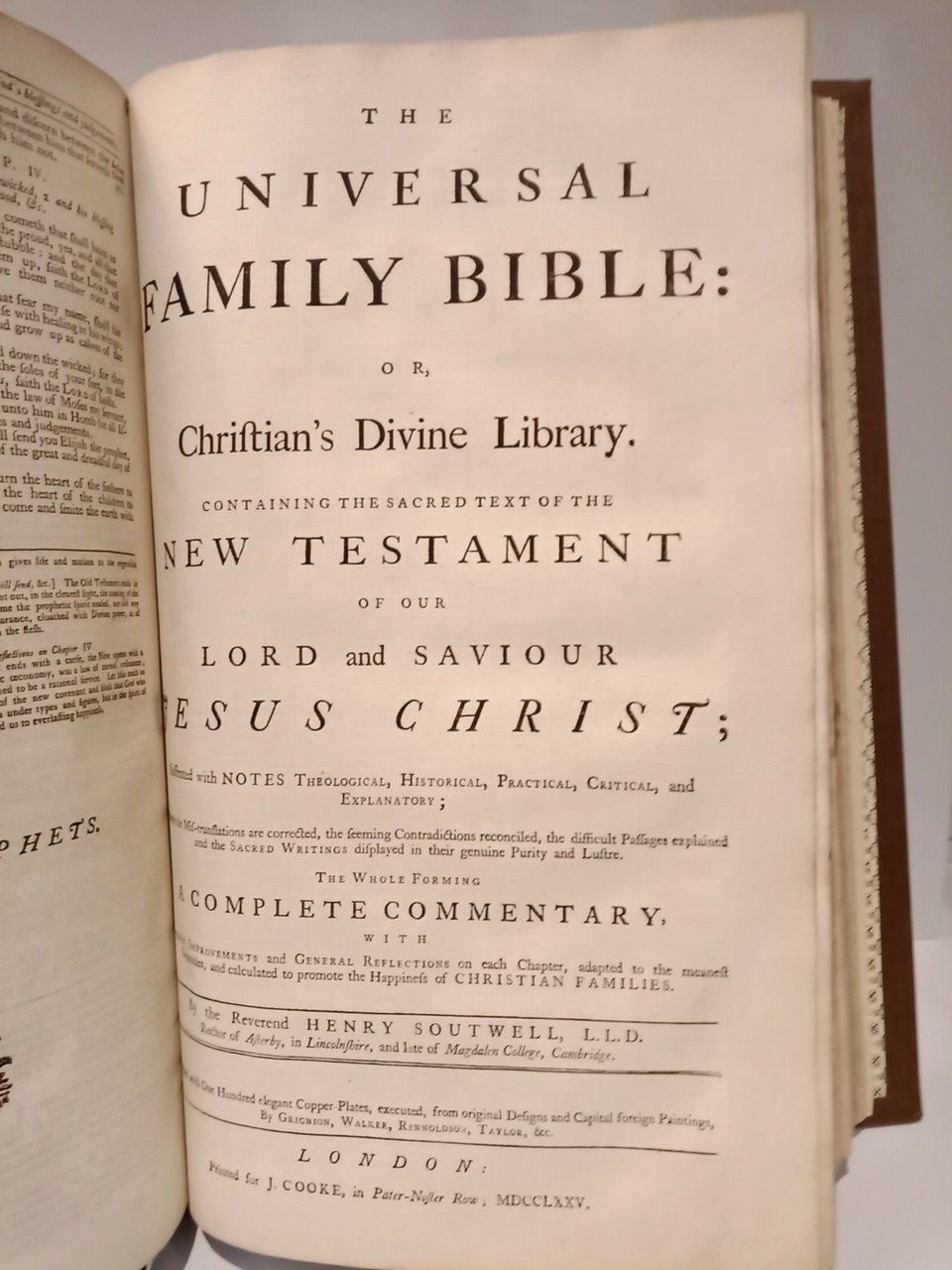 London: Printed for J. Cooke, in Pater-Noster-Row, MDCCLXXVII [1777, Antiguo Testamento] y MDCCLXXV [1775, Nuevo Testamento].- 2 Vols. con [423 h.] y [171 h.] sin numerar respectivamente: incluyendo 97 láminas a plena página grabadas al cobre, aparte de varios índices de nombres, cronología, lugares, medidas, grabados y al final una lista de suscriptores; Folio imperial (40,5 x 27,2 cm); Impresión a dos columnas con interesantes notas al pie, letras capitulares; Ambos volúmenes encuadernados en un mismo tomo en Tela nueva.* Faltan los "Apocrypha" junto a sus 6 láminas, pero tanto el Antiguo como el Nuevo Testamento se encuentran completos con todas sus láminas. Perforaciones de polilla muy leves, parcialmente restauradas, en los márgenes blancos de algunas hojas, nunca tocando el texto o los grabados. Por lo demás señales habituales del tiempo, pero en general muy buen ejemplar, con el papel fuerte y limpio. Esta Biblia fue realmente compilada por Robert Sanders, aunque en la portada figura Henry Southwell, quien prestó su nombre por el pago de cien guineas. El reverendo Southwell fue rector de Asterby en Lincolnshire y miembro del Magdalen College de Cambridge. Los "Apocrypha" que faltan son los llamados Libros Deuterocanónicos, es decir los escritos incluidos en la Septuaginta o Biblia griega; deberían encontrarse entre el Antiguo y el Nuevo Testamento, pero el protestantismo los considera apócrifos (no confundir con los Evangelios Apócrifos), por tanto no sería de extrañar que quien reencuadernara el libro prescindiera voluntariamente de esta parte. El Nuevo Testamento está publicado dos años antes, pero desconocemos si éste fue el caso o si pertenece a una edición anterior; de todas formas ambos volúmenes presentan un aspecto totalmente homogéneo, con la misma caja de impresión. BÍBLICA