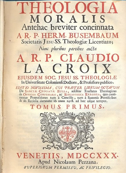 Theologia moralis Antehac breviter concinnata A R. P. Herm. Busembaum, nunc pluribus partibus aucta Claudio La Croix. Editio novissima, cui praeter librum octavum de Sanctae Cruciatae Bulla, additur tractatus theologicus de Officiis Confessarii, ac Bibliotheca Erronea, qua continentur propositiones tum a Conciliis, tua a Summis Pontificibus e ab Ecclesia damnatae ab anno 1418 ad hoc usque tempus.