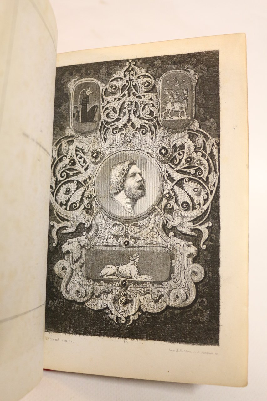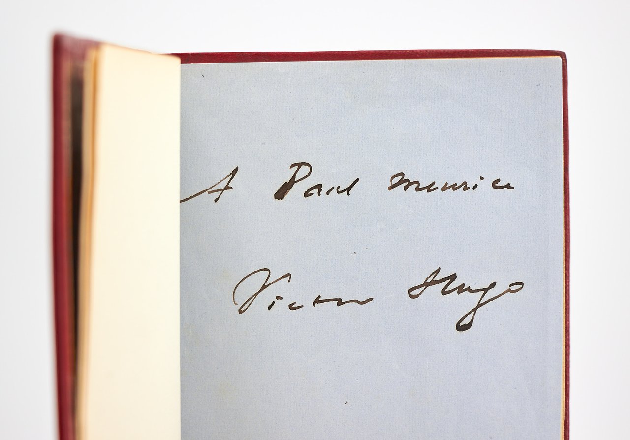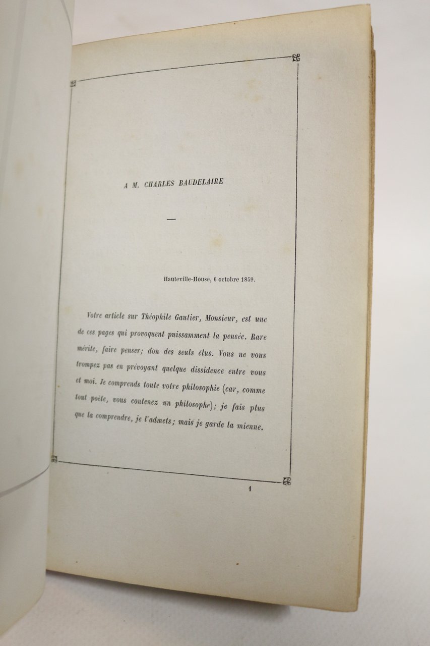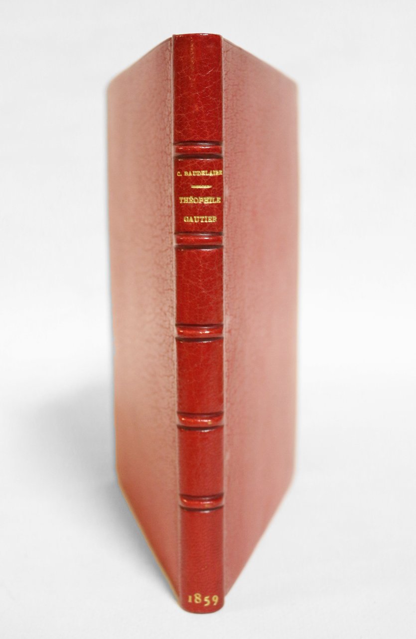 Poulet Malassis & De Broise | Paris 1859 | 11.50 x 18 cm | relié | Théophile Gautier. Notice littéraire précédée d'une lettre de Victor Hugo Poulet-Malassis et de Broise | Paris 1859 | 11.5 x18 cm | full morocco First edition, of which only 500 copies were printed. Portrait of Théophile Gautier etched by Emile Thérond on the frontispiece. Important preface letter by Victor Hugo. Bound in red morocco, gilt date at the foot of spine, marbled endpapers, Baudelairian ex-libris from Renée Cortot's collection glued on the first endpaper, wrappers preserved, top edge gilt. Pale foxing affecting the first and last leaves, beautiful copy perfectly set. Rare handwritten inscription signed by Charles Baudelaire: “ à mon ami Paul Meurice. Ch. Baudelaire. ” (“To my friend Paul Meurice. Ch. Baudelaire.”) This exceptional handwritten dedication to Paul Meurice, a real surrogate brother to Victor Hugo, bears witness to a unique literary meeting between two of the most important French poets, Hugo and Baudelaire. Provenance: Paul Meurice, then Alfred and Renée Cortot. * Paul Meurice was indeed the essential intermediary between the condemned poet and his illustrious exiled peer, since asking Victor Hugo to combine their names in this Théophile Gautier elegy was one Charles Baudelaire's most daring acts and would, no doubt, not have had a chance of being realised without Paul Meurice's precious support. Paul Meurice, Dumas' ghost-writer, author of Fanfan la Tulipe and the theatre adaptations of Victor Hugo, George Sand, Alexandre Dumas and Théophile Gautier, was a talented writer who was shadowed by the great artists of his time. His unique relationship with Victor Hugo, however, gave him a decisive role in literary history. More than a friend, alongside Auguste Vacquerie, Paul replaced Victor Hugo's deceased brothers: “I lost my two brothers; him and you, you and him, you replace them; only I was the youngest; I became the eldest, that's the only difference.” It is to this brother at heart (whose marriage he witnessed alongside Ingres and Dumas) that the exile entrusted his literary and financial interests and it is he who he will appoint, along with Auguste Vacquerie, as executor of his will. After the poet's death, Meurice founded the Maison Victor Hugo, which is still today one of the writer's most famous residences. In 1859, Paul's house then became Victor Hugo's Parisian antechamber on the Anglo-Norman rock, and so naturally Baudelaire went to speak to this official ambassador. The two did not know each other well but they had a mutual friend, Théophile Gautier, with whom Meurice had worked since 1842 on an adaptation of Falstaff. Consequently, he is the ideal intermediary to guarantee the inaccessible Hugo's benevolence. Baudelaire had, however, already briefly met Victor Hugo. At the age of 19 he asked for an interview with the greatest modern poet, whom he had worshiped since childhood: “I love you as one loves a hero, a book, as one loves everything beautiful purely and without interest.” He already dreamed of himself as a worthy successor, as he tacitly confessed to him: “at nineteen years old would you have hesitated over writing as much to [.] Chateaubriand for example?” For the young apprentice poet, Victor Hugo belonged to the past, and Baudelaire will quickly want to free himself of this heavy model. From his first work, Le Salon de 1845, the iconoclast Baudelaire criticized his old idol by declaring the end of Romanticism, of which Hugo is the absolute representative: “These are the last ancient ruins of romanticism [.] It is Mr Victor Hugo who lost Boulanger - after having lost so many others – It is the poet who caused the painter to fall into the pit.” One year later, in Le Salon de 1846 he reiterated his attack even more fiercely, removing the Romantic master from his throne: “because if my definition of romanticism (intimacy, spirituality, etc.) puts Delacroix at the head of romanticism, it naturally excludes M