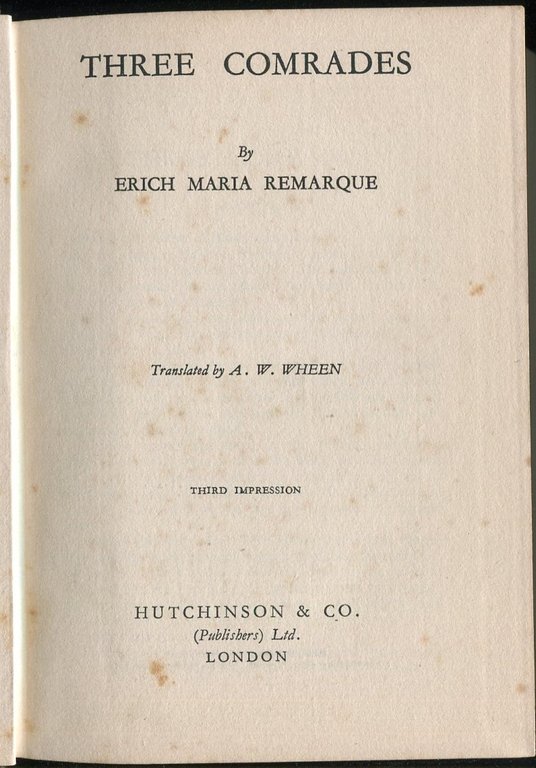 No marks or inscriptions. No creasing to covers or to spine. Foxed but clean very tight pages with unmarked black cloth boards, dusty/tanned page edges, slightly rubbed spine ends and no bumping to corners. 448pp. A story of three struggling young Germans, still traumatised by experiences in the trenches in World War One. Translated by A. W. Wheen. Third Edition.