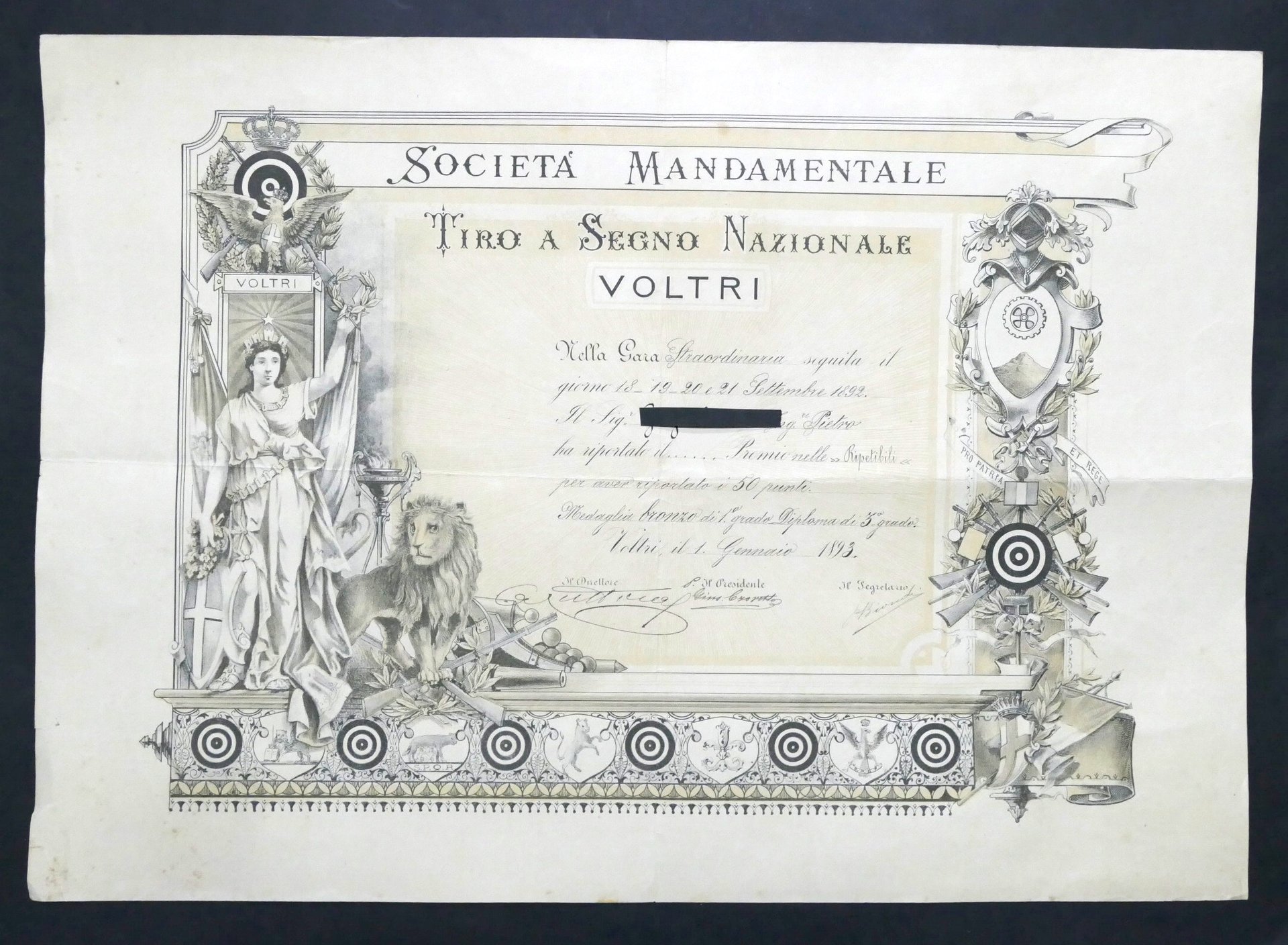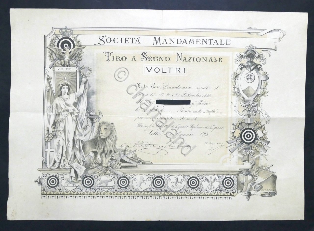 Tiro a Segno Nazionale - Voltri - Diploma Medaglia di Bronzo - datato 1 Gennaio 1893 Un cartoncino ripiegato, dimensioni: 42 x 60 cm ca. Buone condizioni. Piccoli strappi al bordo sinistro.