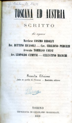 Toscana ed Austria. Scritto dai signori Marchese Cosimo Ridolfi - Bar. Bettino Ricasoli - Cav. Ubaldino Peruzzi - Avvocato Tommaso Corsi - Avv. Leopoldo Cempini - Celestino Bianchi. Seconda edizione fatta su quella di Firenze