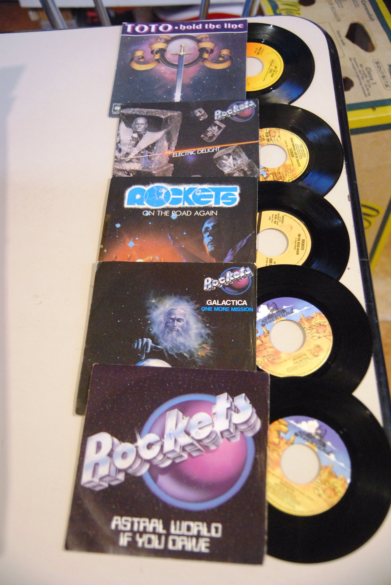 cinque vinili 45 giri toto hold the line, rockets electric delight on the road again galactica one more mission astral world if you drive. .