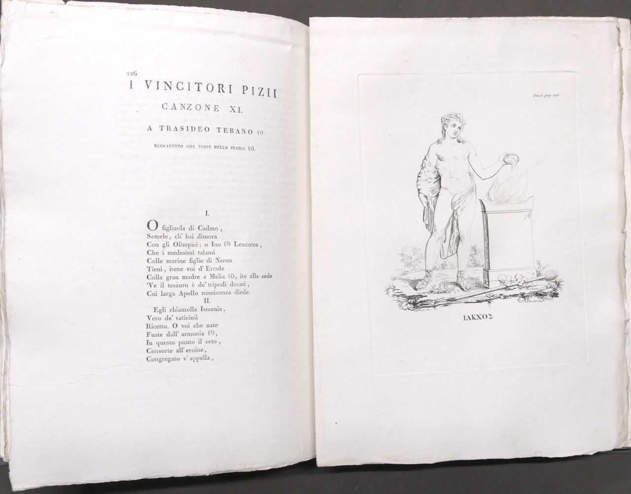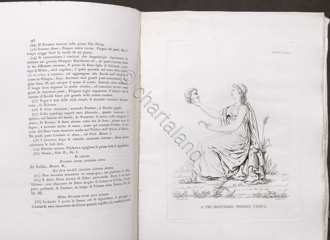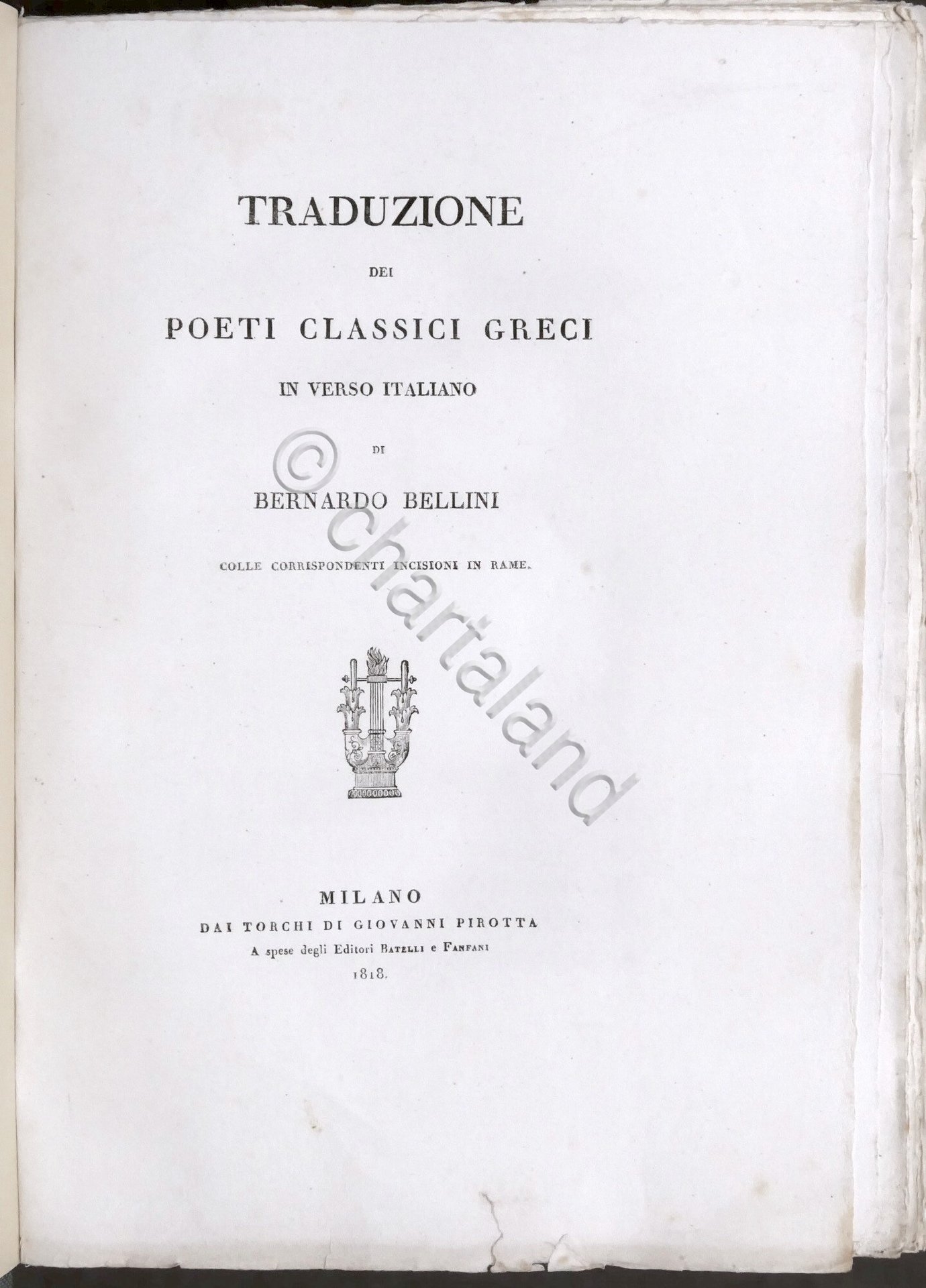 Traduzione dei poeti classici greci in verso italiano di Bernardo Bellini colle corrispondenti incisioni in rame Milano, dai torchi di Giovanni Pirotta. A spese degli editori Batelli e Fanfani, 1818 Pag. 384 con tavole f.t. Copertina rigida non coeva - Testo in italiano. Condizioni buone. Frontespizio come da foto. Legatura e sguardie rifatte.