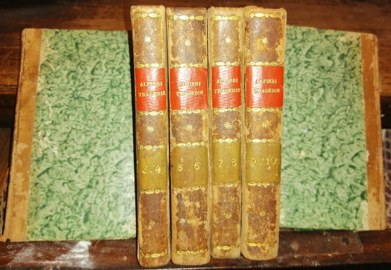 In-12 (14,5 cm) 12 tomi in 6 volumi (1) c. (ritratto) (2) c. (di tavole) 120, (2) c. 111 (1); (2) c. (di tavole) 115 (1), (2) c. (di tavole) 110; (2) c.(di tavole) 150, (2) c. (di tavole) 117 (1); (2) c. (di tavole) 115 (1), (2) c. (di tavole) 104; (2) c. (di tavole) 114, (2) c. (di tavole) 176; 2 c.(di tavole) 141 (1), (1) c. (di tavole) 158. Mezza pelle con piati rivestiti di carta marmorizzata, tassello rosso al dorso e caratteri dorati. Ritratto dell'autore in antiporta, 23 vignette, una prima di ogni opera e del parere dell'autore, due per ogni tomo, tranne l'ultimo che ne ha solo una. Tragedie contenute: Filippo, Polinice, Virginia, Antigone; Agamennone, Oreste, Rosmunda, Ottavia; Timoleone, Merope, Maria Stuarda, La Congiura dei Pazzi; Don Garzia, Saul, Agide, Sofonisea, Bruto primo, Mirra, Bruto secondo, Abele, Alceste seconda di Euripide, Antonio e Cleopatra, Lettera di Ranieri de' Calsabigi all'autore