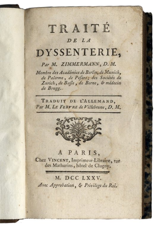 Traité de la Dyssenterie. Traduit de l'allemand par Le Febure de Villebrune. | Libri antichi e moderni | ZIMMERMANN, Johan Georg.