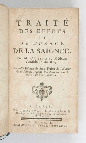 Traité des effets et de l’usage de la saignée. Nouvelle edition de deux traités de l’auteur sur la saignée, réunis, mis dans un nouvel ordre, & très-augmentés. | Libri antichi e moderni | Quesnay, François.