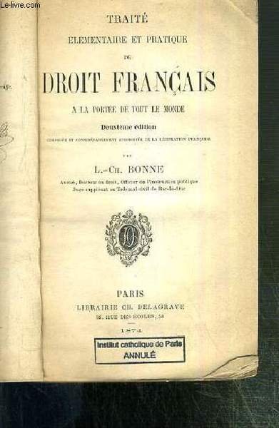 TRAITE ELEMENTAIRE ET PRATIQUE DE DROIT FRANCAIS A LA PORTEE DE TOUT LE MONDE - 2eme EDITION | Libri antichi e moderni | Bonne L.-Ch.