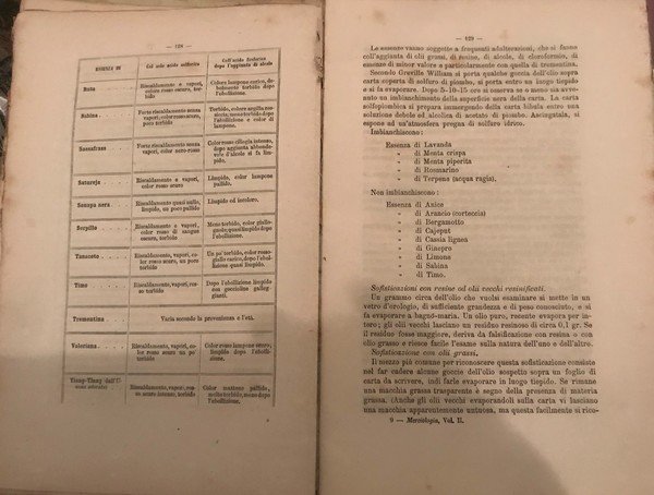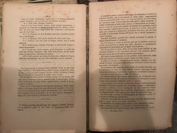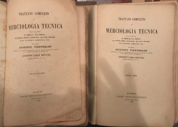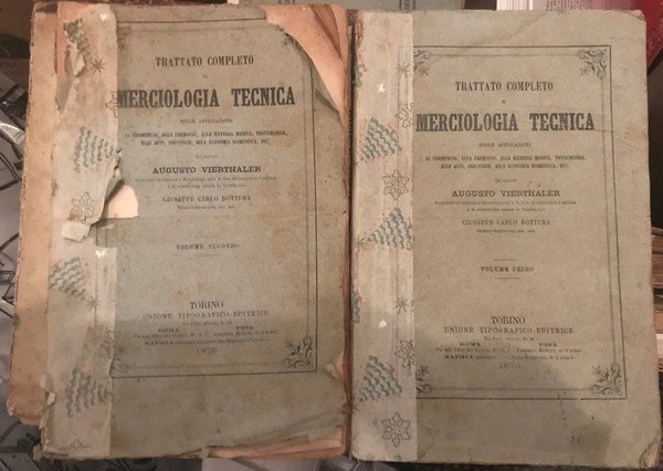 Vierthaler, Professore di Chimica e Merciologia all'I. R. di commercio e nautica e di costruzione navale in Trieste, ecc. - Bottura, Chimico farmacista, ecc. ecc. - Introduzione - Bibliografia - Registro alfabetico dei nomi comuni - Registro alfabetico dei nomi botanici contenuti nel secondo volume 25x16 cm., in brossura, pp. 617, 139 figure nel testo; 565 (2), 88 figure nel testo; pagine non refilate, numerose tabelle, prima edizione, in italiano; dorsi rinforzati e piccole lacerazioni anche ai rinforzi, piccola mancanza in alto della copertina del primo volume e manca la controcopertina al secondo volume, ma buon esemplare