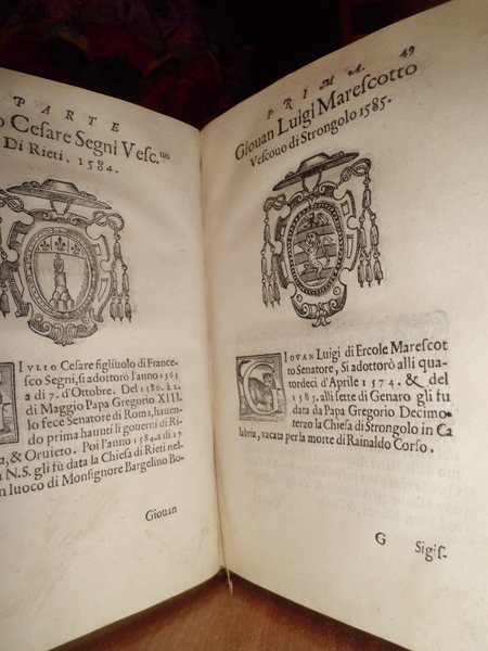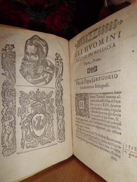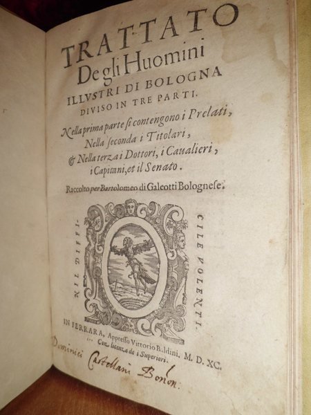 Trattato Degli Huomini Illustri di Bologna diviso in tre parti. Nella prima parte si contengono i Prelati, Nella seconda i Titolari, Nella terza i Dottori, i Cavalieri, i Capitani, et il Senato. Raccolto per Bartolomeo, di Galeotti Bolognese. In Ferrara, Appresso Vittorio Baldini, 1590. In - 4°, pergamena coeva. 1 f. bianco, marca Tipografica al frontespizio, 135 pp. 1 f. bianco, capilettera e finalini xilografici, ritratto del Papa Boncompagni, 6 stemmi con cappelli cardinalizi stampati in rosso, numerosi altri stemmi nel testo incisi in legno. Rarissima prima ed unica edizione di questo importante testo di araldica bolognese. Lozzi, 386, "Raro". Frati, Bibl. bolognese, 8552.