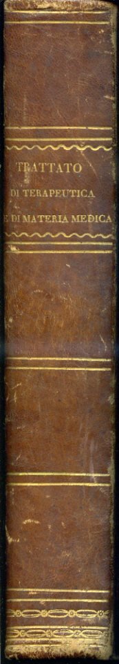 In-4°, pp. X, (2), 657, (3), legatura coeva m. pelle marrone con titolo, filetti e fregi in oro al dorso. Testo bicolonne. Fioriture normali. Ottimo stato. Prima edizione italiana di questa ampia farmacopea (Traité de thérapeutique et de matière médicale, Paris, 1836-1839) compilata a quattro mani dal Trousseau e dal Pidoux. Garrison Morton, n. 1967: 'This work contains a large amount of information on the various articles of materia medica, collected from the best authorities, interspersed with much original matter'.