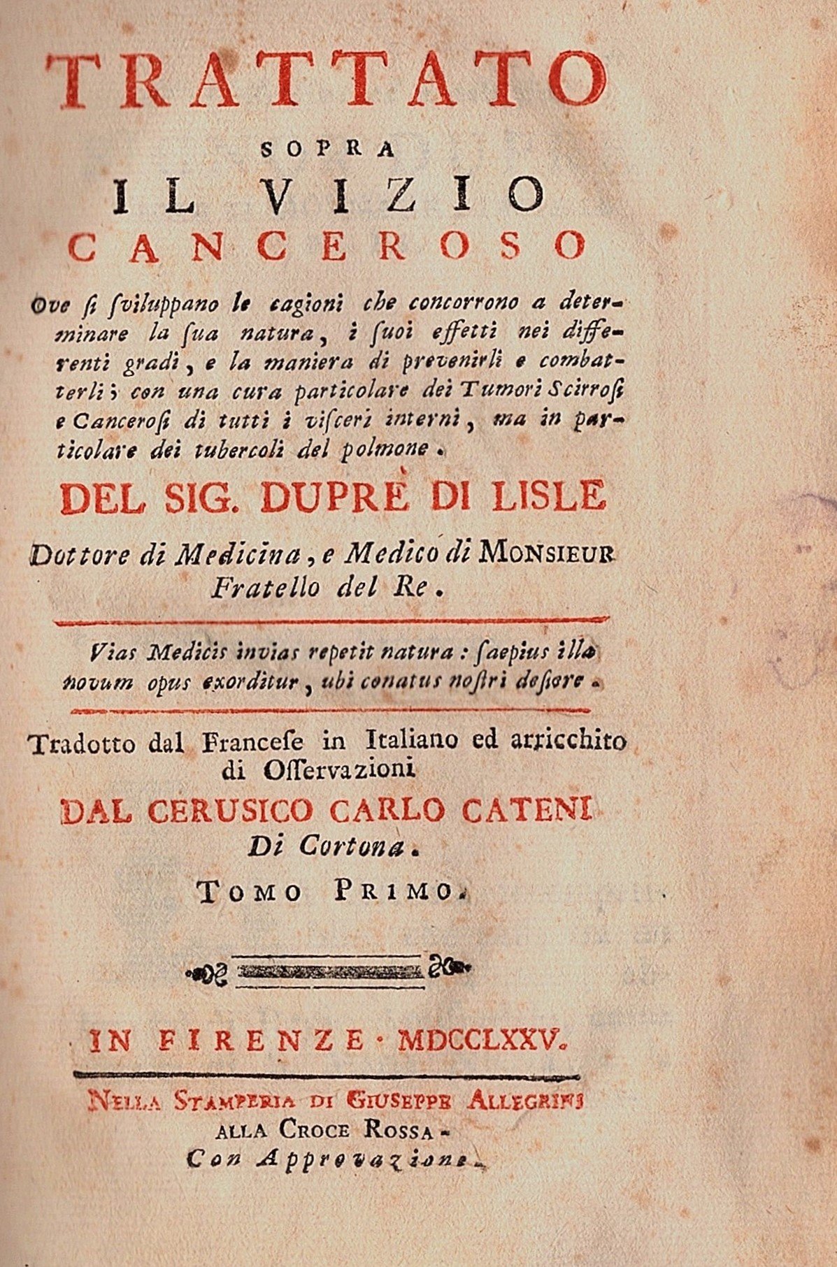 Trattato sopra il vizio canceroso ove si sviluppano le cagioni che concorrono a determinare la sua natura, i suoi effetti nei differenti gradi, e la maniera di prevenirli e combatterli; con una cura particolare dei tumori scirrosi e cancerosi di tutti i visceri interni, ma in particolare dei tubercoli del polmone. Del sig. Duprè di Lisle . Tradotto dal francese in italiano ed arricchito di osservazioni dal cerusico Carlo Cateni di Cortona. Tomo primo