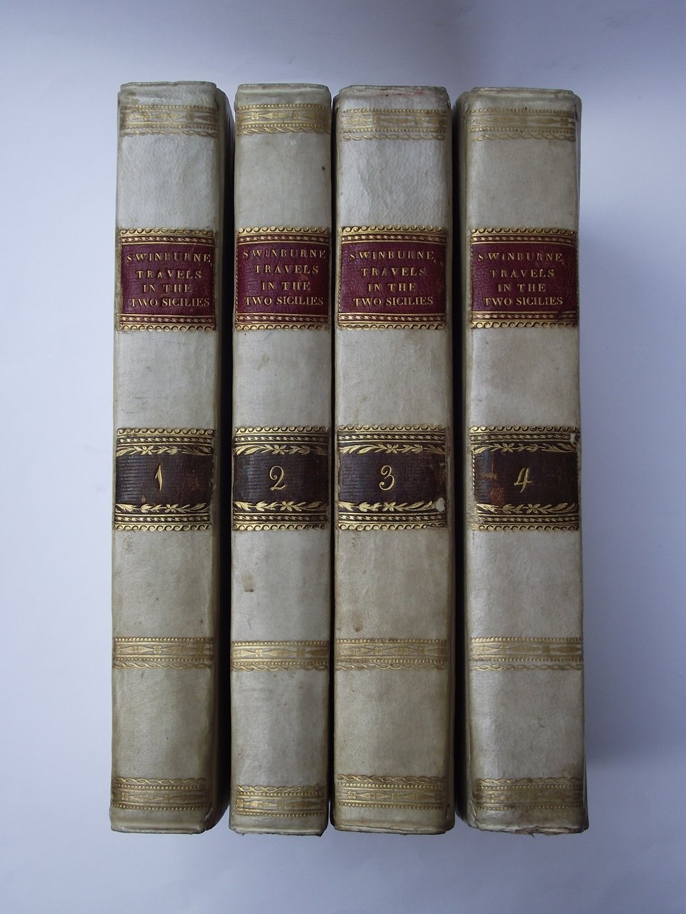 Quattro volumi di cm. 22,5, pp. lxviii, 307; xi, 359; viii, 414 (2); viii, 394 (2). Con 24 tavole in rame ripiegate f.t. fra cui 22 vedute, un albero genealogico e una carta geografica dell'Italia Meridionale. Bella legatura coeva piena pergamena, dorsi lisci con fregi in oro e titoli su tasselli bicolore. Bell'esemplare, fresco, genuino ed in ottimo stato di conservazione. Terza edizione, con menzione fittizia di seconda edizione, di questo famoso resoconto di viaggi in Sud Italia del Swinburne (Bristol, 1743-Trinidad, 1803). L'edizione originale era apparsa a Londra in due voll. nel 1783-85. Le principali località interessate nell'itinerario di viaggio sono: Napoli, Sorrento, Taranto, Reggio Calabria, Paestum, Palermo, Agrigento, Siracusa, Messina, Tropea, Roma e Avezzano. Cfr. Pine-Coffin 773: "A more comprehensive work than Brydone's Tour"; Mira, II, 392.