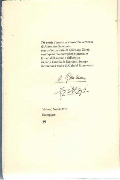 "TRE POESIE D'AMORE in vernacolo veronese di Antonino Gammaro con un'acquaforte di Giordano Zorzi: centoquaranta esemplari numerati e firmati dall'Autore e dall'Artista su Carta Umbria di Fabriano. Stampa in torchio a mano di Gabriel Rummonds" - Il nostro esemplare è il numero 39. Copia pari al nuovo, spedizione in 24 ore dalla conferma dell'ordine.
