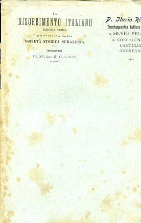 In-8°, pp. 70, brossura editoriale a stampa. Fioriture alla brossura e alcune bruniture interne, ma in buono stato. Edizione originale di queste lettere al Pellico dei tre noti patrioti risorgimentali. Il Risorgimento Italiano. Nuova serie pubblicata dalla Società Storica Subalpina (estratto). Vol. XV, fasc. III-IV, n. 31-32.