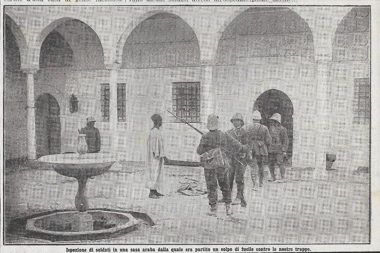 Tripoli. Ispezioni di soldati in una casa araba. Stampa 1911