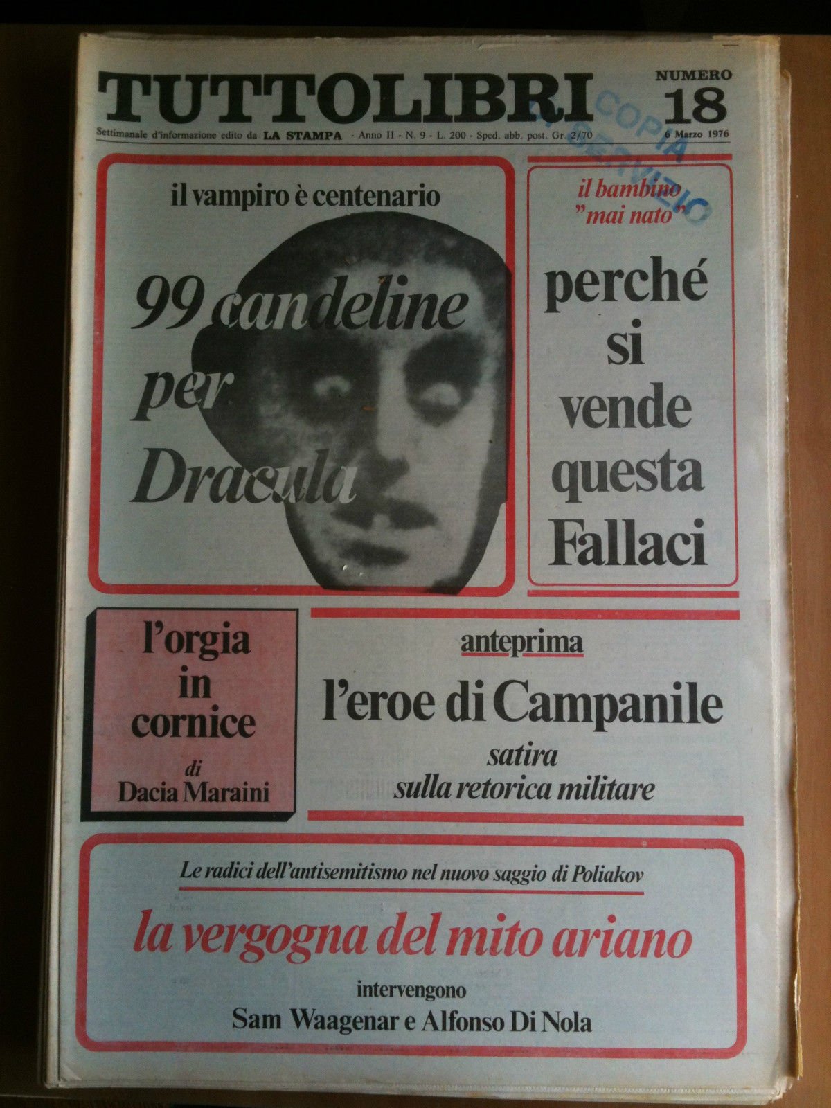 TUTTOLIBRIAnno II n^ 18 - 6 Marzo 1976Settimanale d'informazione edito da La Stampail vampiro è centenario 99 candeline per Dracula - Il bambino mai nato, perchè si vende questa Fallaci - l'orgia in cornice di Dacia Maraini - Le radici dell'antisemitismo nel nuovo saggio di Poliakov la vergogna del mito ariano intervengono Sam Waagenar e Alfonso Di Nola20 pagine formato 30x43 cm (62 g)E2467