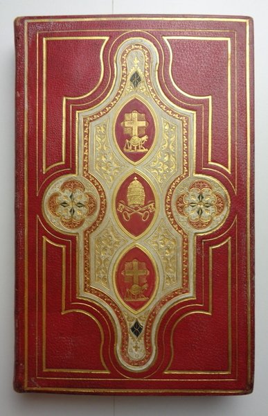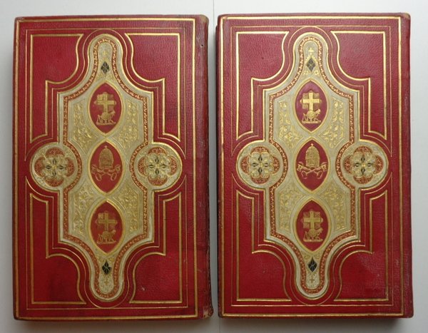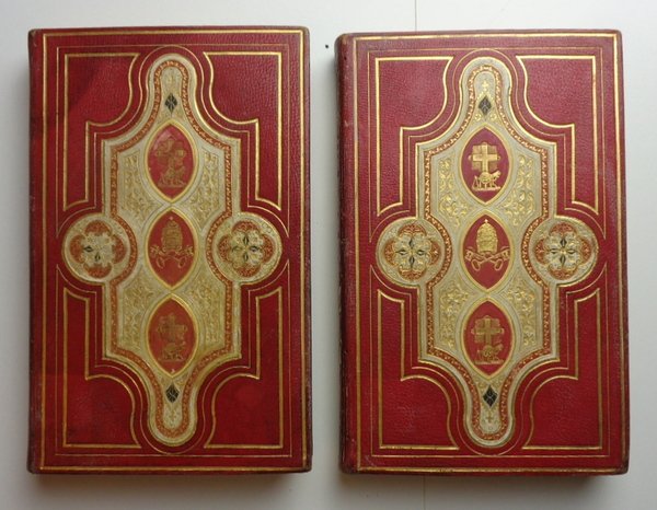 First Edition. Due volumi (13x22 cm) di 376 e 321 pagine. Carta geografica a colori, ripiegata, e illustrazioni incise su tavole ripiegate fuori testo. Timbri di proprietà ritagliati alle pagine di titolo. Legature mosaicate in piena pelle rossa, doppia cornice dorata, composizione al centro dei piatti con pelle bianca decorata a piccoli ferri dorati, con due tondi di fiori mosaicati e dorati con inserti verdi, tre medaglie con croce, chiavi di San Pietro e strumenti scientifici. Dorsi lisci con titoli e fregi dorati. Risguardie in seta con cornice dorata; una gora al retro dei piatti anteriori; tagli dorati. Minime usure agli angoli, una parte più scura all'angolo superiore del Vol 1; peraltro condizioni molto buone per questa legatura mosaicata di ottima fattura (inglese?). Rif. Esposta alla mostra Rilegatura d'arte antica pontificia, Museo civico, Albano, 1988.