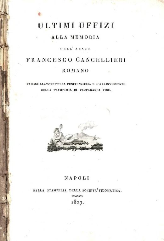 Raccolta di componimenti poetici in ricordo dell'abate Cancellieri, fra gli autori figurano: Carlo Emanuele Muzzarelli, Angelo Maria Ricci, Tommaso Gnoli, Giuseppe Antinore, Antonio Mezzanotte, Agnello dei duchi Giordani, Vincenzo Caracciolo, Agnello Maria Carfora, Angelo Pocobelli, Desiderio Pallocchi e molti altri. Brossura filo refe datata a cui manca la coperta, ne rimane qualche resto solo al dorso, la cerniera è salda, pagine in carta pergamena segnate da muffe sparse, testo fruibile stampato con margini molto ampi. Vignetta incisa all'acquaforte al frontespizio con vedutina del Vesuvio in eruzione. N. pag. 94.