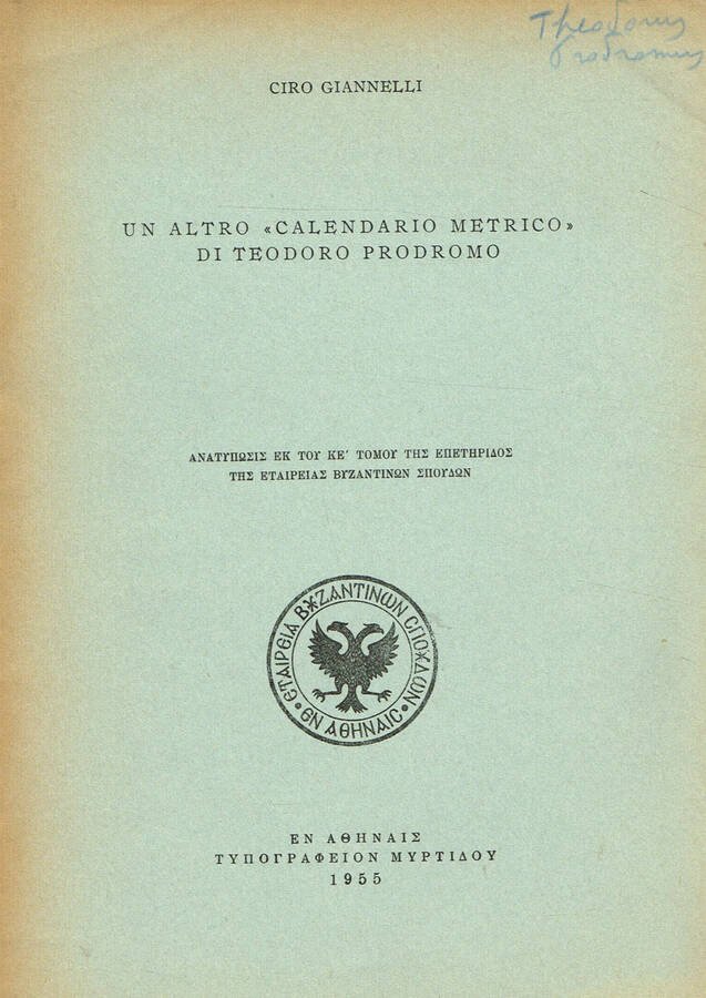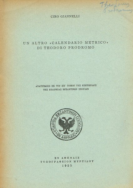 UN ALTRO CALENDARIO METRICO DI TEODORO PRODROMO | Libri antichi e moderni | Ciro Giannelli