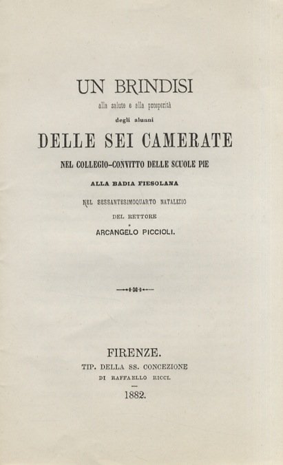 Un brindisi alla salute e alla prosperità degli alunni delle sei camerate nel Collegio-convitto delle Scuole Pie alla Badia Fiesolana, nel sessantesimoquarto natalizio del rettore Arcangelo Piccioli. | Libri antichi e moderni | Piccioli Arcangelo.