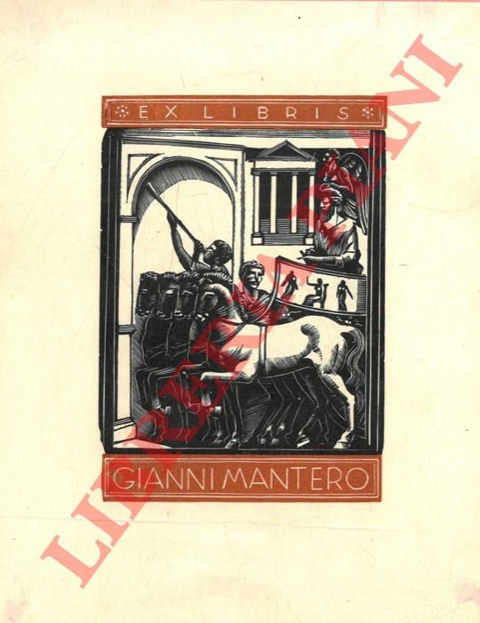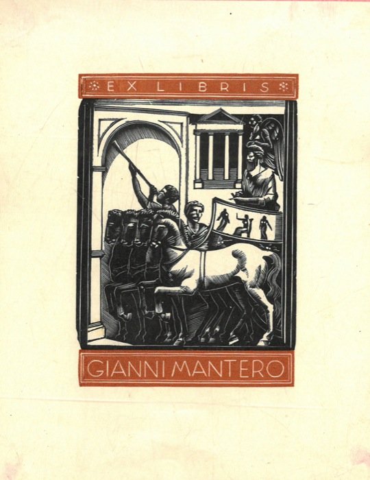 Un foglietto xilografico per Gianni Mantero, cm. 14,5 x 11,2 (Trionfo a Roma antica)