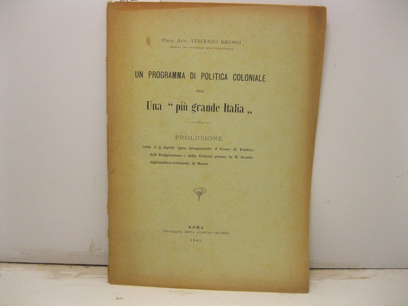 Un programma di politica coloniale per una 'piu' grande Italia'. Prolusione letta il 9 aprile 1902, inaugurando il Corso di Politica dell'Emigrazione e delle Colonie presso la R. Scuola diplomatico-coloniale di Roma | Libri antichi e moderni | Grossi Vincenzo