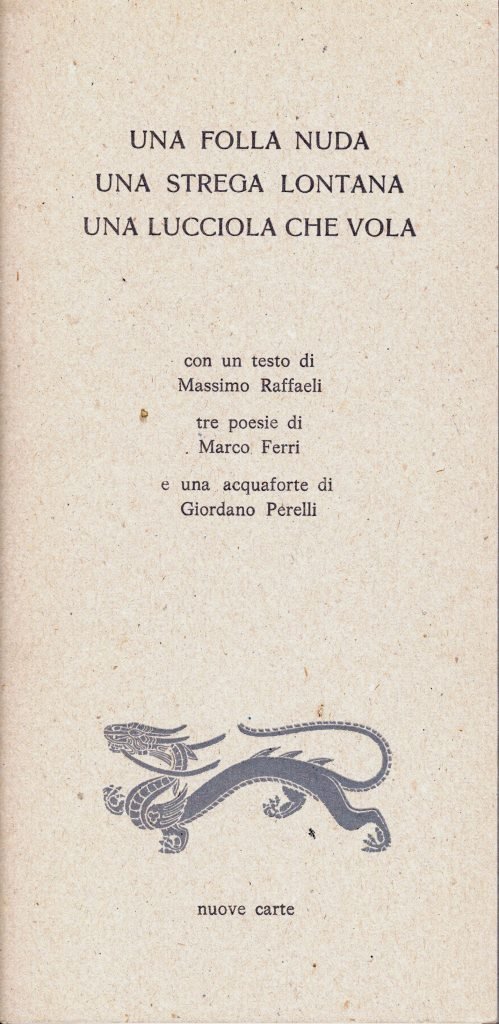 Una folla nuda, una strega lontana, una lucciola che vola, prima edizione dicembre 1995, formato 12 x 25.<BR>Copertina morbida di colore grigio con titoli in nero al piatto anteriore. Volume non rilegato.All'interno un testo di Massimo Raffaelli, tre poesie di Marco Ferri e un'acquaforte di Giordano Perelli.Edizione stampata in 75 esemplari numerati. Nostra n. 71.<BR>Ottime condizioni.