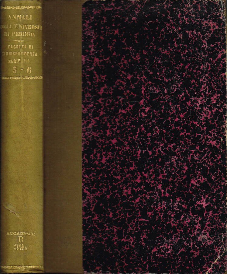 Anni 1907 e 1908 completi, composti da Volume V e Volume VI, rispettivamente di 193 e 283 pagine, rilegati in un unico volume, della collana Università degli Studi in Perugia - Annali della Facoltà di Giurisprudenza - Serie III, direttore: Prof. Oscar Scalvanti. Volume V, del 1907, Unione Tipografica Cooperativa, Perugia; Volume VI edito nel 1908 dalla Tipografia Guerriero Guerra, Perugia. Volume della prima decade del '900 in stato discreto, rilegato con coperta, non coeva, in mezzatela con angoli, piatti marmorizzati, sul dorso fregi e caratteri dorati in bassorilievo, alcuni segni del tempo, tracce di fioritura sparsa, tagli leggermente ambrati con barbe, pagine in buono stato, risguardie con presenza di gora. Il rilegatore ha mantenuto all'interno del volume i piatti originali del I.o fascicolo di ogni anno, in carta, quello anteriore con timbro ex biblioteca e fregio. Presenta timbro ex biblioteca e catalogazione bibliotecaria in parte manoscritta su frontespizio, timbro ex biblioteca su excipit. Lingue: Italiano, Latino. Numero Pagine 476