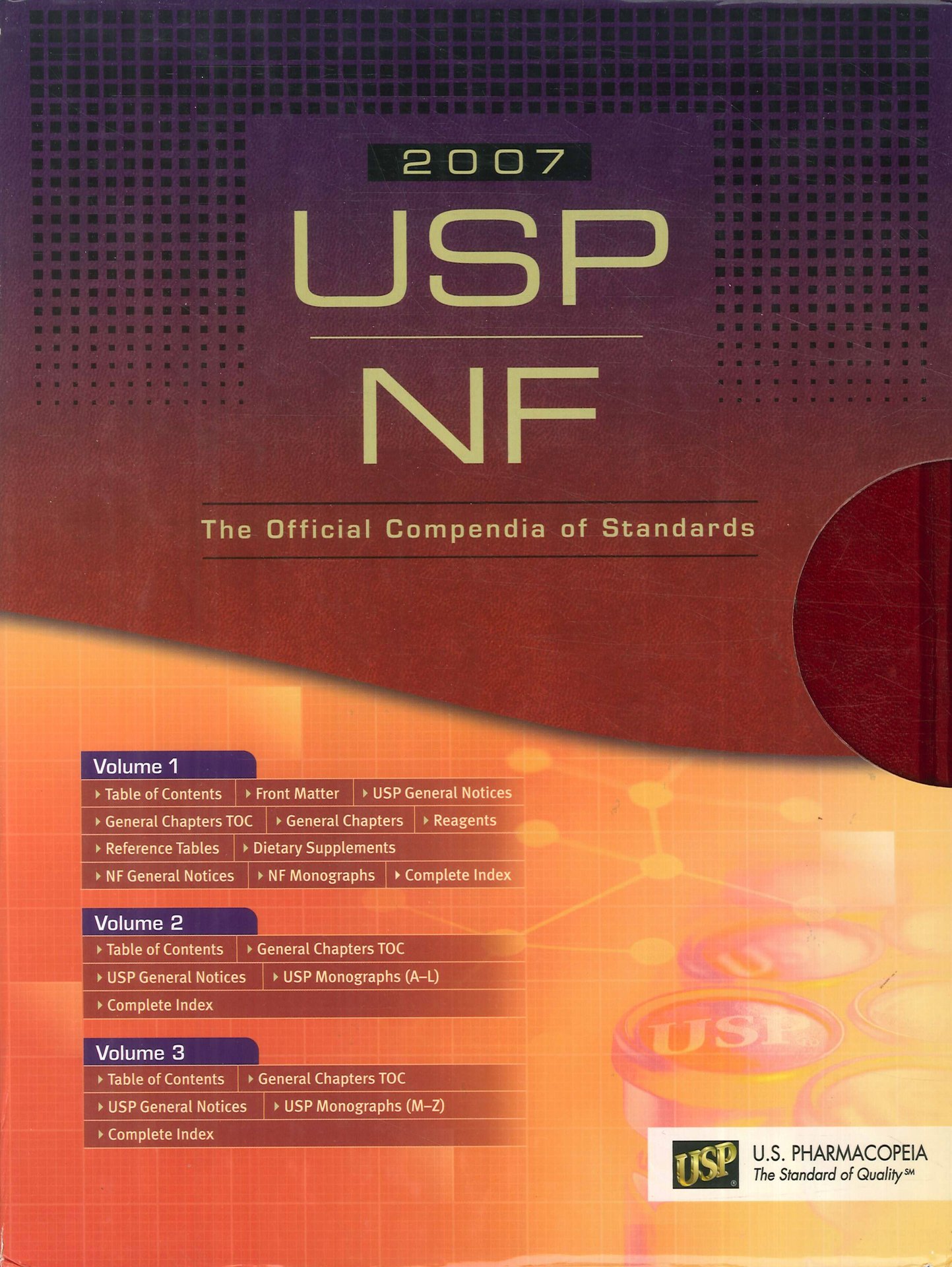 Usp Nf 2007: 3 Vol. First Supplement 2007: 1 Vol. (without vol.2). USP-NF Electronic Formats: 1 CD. English Text. Rockville, 2006; 4 vols., leather bound in a case, pp. 3900, cm 22x29,5.