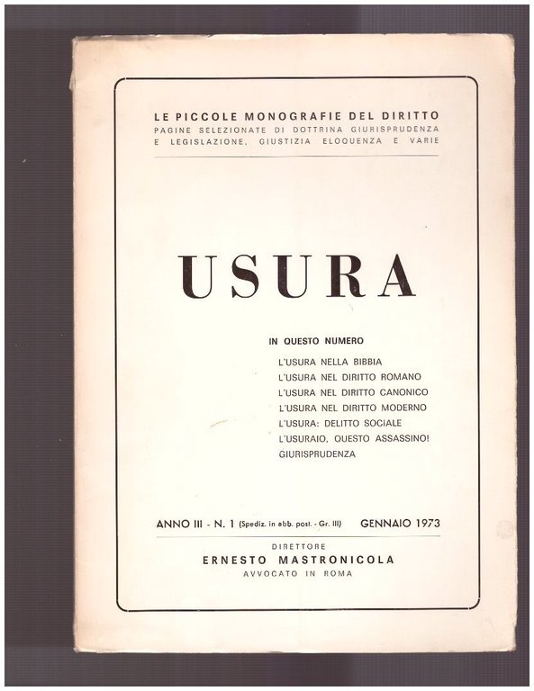 Nella Collana Piccole Monografie del Diritto - Pagine selezionate di dottrina giurisprudenza e legidslazione, giustizia eloquenza e varie - Anno III n.1. Piccolo fascicolo 24.5x17,5 in copertina flessibile cartonata lucida con alette informative, normali e fisiologici segni di polvere e del tempo. Agli interni pagine color avorio come da origine, lieve indoratura ai margini esterni, tagli regolari impolverati, legatura a colla. Buono. 39 Buono (Good) .