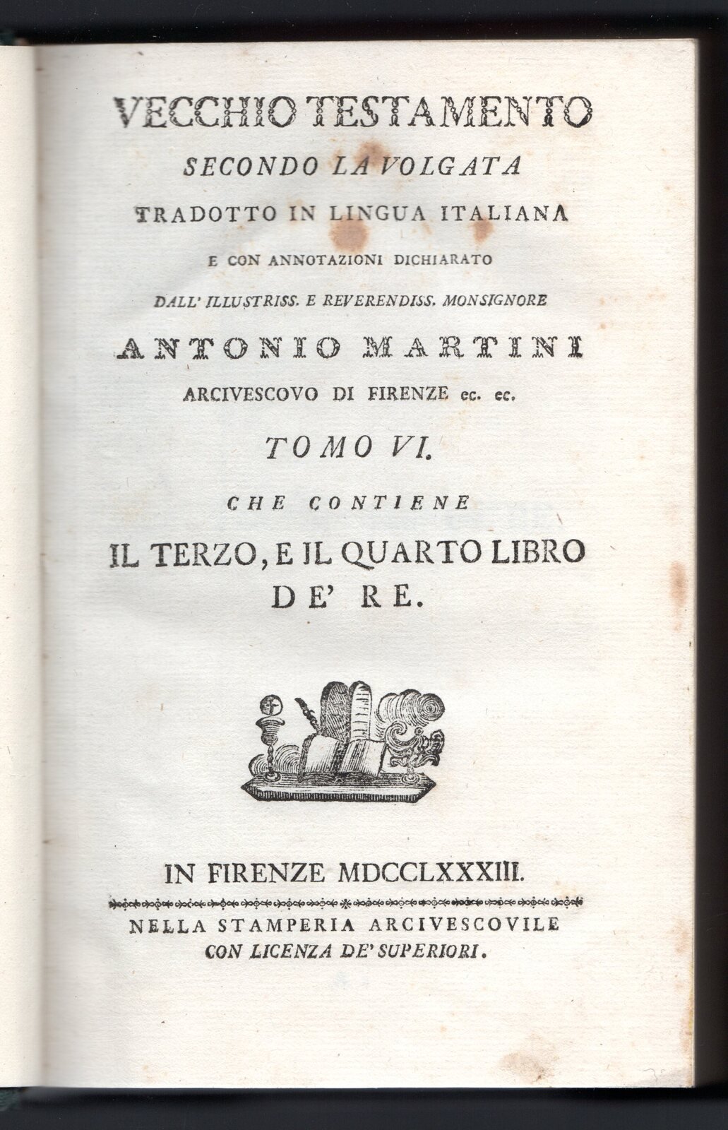 Libro vintage in-16°, cartonato mezza legatura con 379 pagg, Firenze, 1783. Spiritualità. Titolo impresso sul dorso, piatto muto. Note a matita sulle sguardie. Traduzione di Antonio Martini. Testo in lingua latina e italiana.
