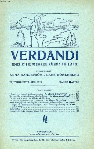VERDANDI, TRETTIOF�RSTA �RG. 1913, FJ�RDE H�FTET, TIDSKRIFT F�R UNGDOMENS M�LSM�N OCH V�NNER | Libri antichi e moderni | Collectif