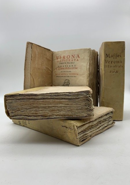 4 volumi in 4, cm 15 x 22,5, pp. XIV + (2) + 678 + (2) + 86 con 1 tavola fuori testo (fra p. 14 - 15); XXXVI + 564 con 13 tavole fuori testo; VIII + 542 + (14) con 27 tavole fuori testo e molte incisioni nel testo; (10) + 384 + (12) con 14 tavole fuori testo. Moltissime incisioni nel testo anche a piena pagina. Frontespizi in rosso e nero con vignette incise. Esemplare estremamente genuino in barbe e cartonatura d'attesa con rinforzo dei dorsi in pergamena realizzato in epoca. Edizione originale nella versione in quarto che usci' contemporaneamente all'edizione in folio. In realta', secondo Fossati Bellani, l'edizione in 4o (cm 15 x 22) viene datata 1731 - 32, mentre quella in folio viene considerata come pubblicata nel 1732 e quindi successiva. Inoltre indica 44 tavole fuori testo mentre il nostro esemplare ne conta 55. Ben nota e' la differenza tra esemplari di quest'opera, portata a termine sotto l'attenzione dell'autore che sovente interveniva anche con modifiche sui singoli esemplari di questa importante e innovativa opera redatta dal Maffei tra il 1728 e il 1732 e che viene considerata uno dei principali monumenti della storiografia veronese. Abbandonato il criterio legato alla morta erudizione e alla dimensione classificatoria legata al particolare, Maffei, nella sua analisi e nelle sue critiche, si rivolge al presente e con una visione che, dalla dimensione veronese, si allarga a tutta la storia d'Italia. Testo multidisciplinare, storico, geografico, epigrafico filologico, non risparmia critiche all'immobilismo di Venezia, alle leggende utilizzate per antedatare la fondazione dell'episcopato cosi' come sottolineava l'esiguita' degli apporti dei longobardi. Fossati Bellani, II, 2485. Gamba, 2325.