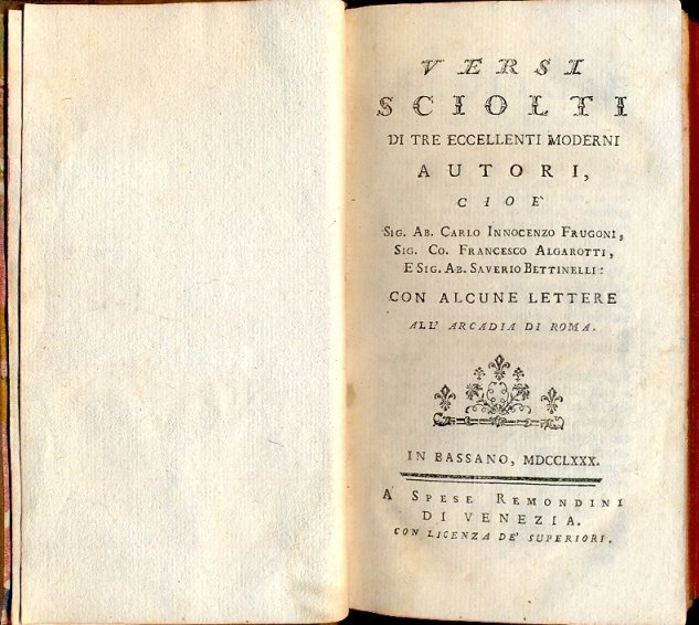 Versi sciolti di tre eccellenti moderni autori. Con alcune lettere all'Arcadia di Roma. | Libri antichi e moderni | Frugoni C. - Algarotti F. - Bettinelli S.