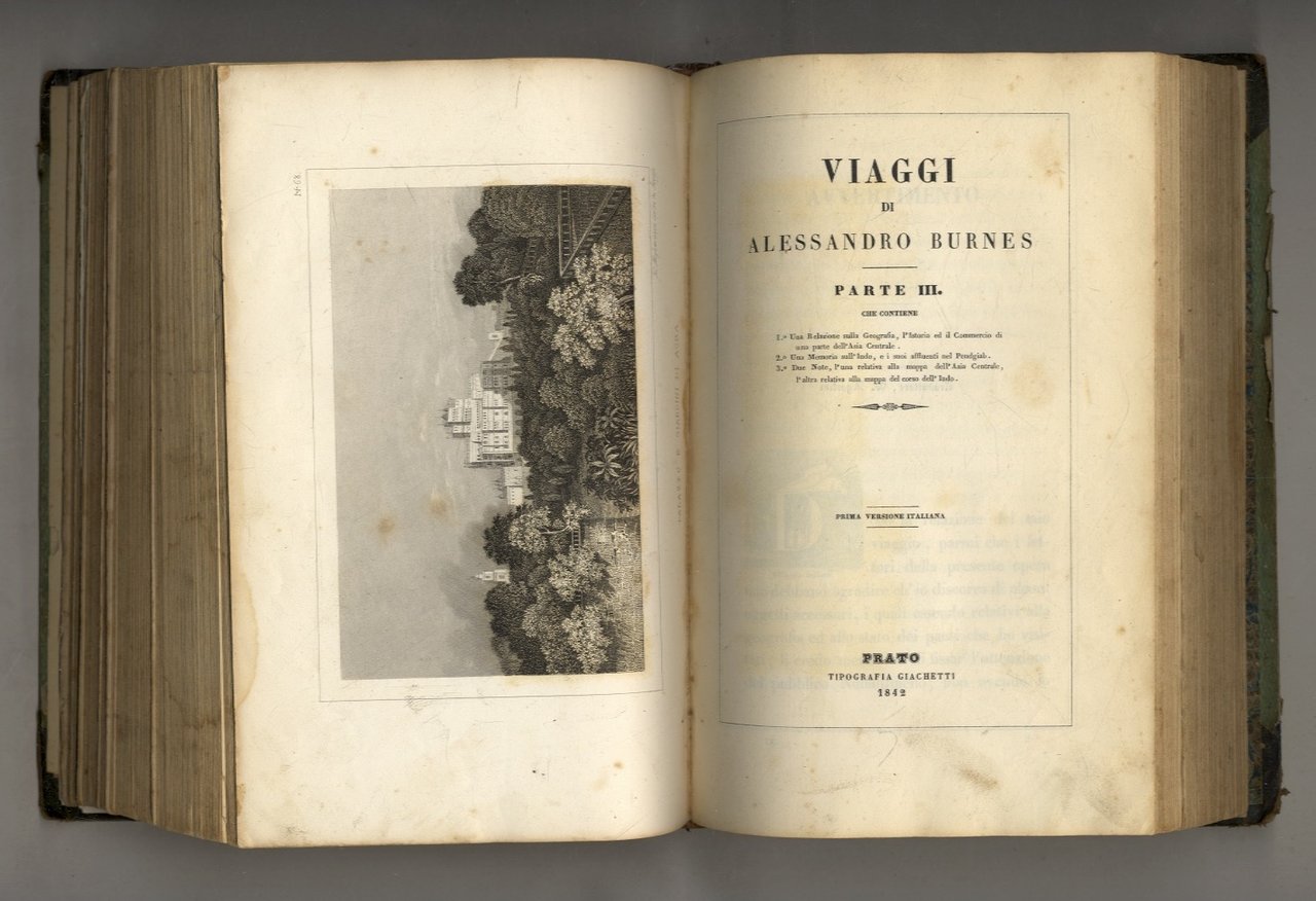 Viaggi di Alessandro Burnes. Parte I. che contiene la Relazione di un viaggio dalla foce dell'Indo a Lahora e la descrizione di quel fiume celebre. (Segue:) Parte II. che contiene la Descrizione di un viaggio da Delhi a Lahora, Cabul, Khunduz, Balkh e Bukhara e nella Turcomania, nel Khorasan ed in Persia. (Segue:) Parte III. che contiene: 1° Una Relazione sulla Geografia, l'Istoria ed il Commercio di una parte dell'Asia Centrale. 2° Una Memoria sull'Indo, e i suoi affluenti nel Pendgiab. 3° Due Note, luna relativa alla mappa dell'Asia Centrale, l'altra relativa alla mappa del corso dell'Indo. Prima versione italiana. | Libri antichi e moderni | Burnes Alexander.