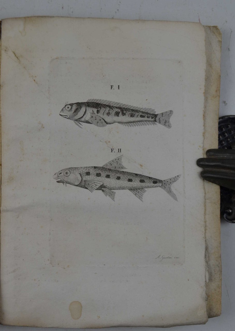 Cm. 19, pp. 152. Con una tavola fuori testo incisa in rame raffigurante due specie di pesci. Bross. originale ornata. Esemplare con qualche traccia d'uso, dorso rinforzato, peraltro marginoso e genuino, in discreto stato di conservazione. Edizione originale ed unica di quest'opera rara e molto interessante. Cfr. Ceresoli (433): "Dà un elenco dei pesci, crostacei e degli uccelli acquatici del lago di Garda".