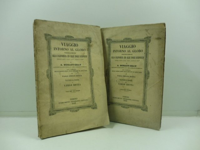 In 8, 2 voll., pp. XVI + 296; 392 + (1) con due vedute alle antip. e due tavv. f.t. in xil. raffiguranti S. Francisco, S. Luis Rey, Fort Ross, e le Hawaii. Danni rip. al d. di entrambi i voll. Gora al margine est. delle ultime 6 cc. e mancanze al margine sup. int. delle ultime 15 cc. del II vol. Br. ed. Prima edizione italiana, integrata dalle osservazioni del medico di bordo Botta, del resoconto dei viaggi del mercante francese Duhaut-Cilly che arrivo' a Yerba Buena nel 1827, fonte importante nella storia dell'esplorazione della California e delle Isole Hawaii. Hill, p. 23; Howes D, 547; Sabin, 21164.