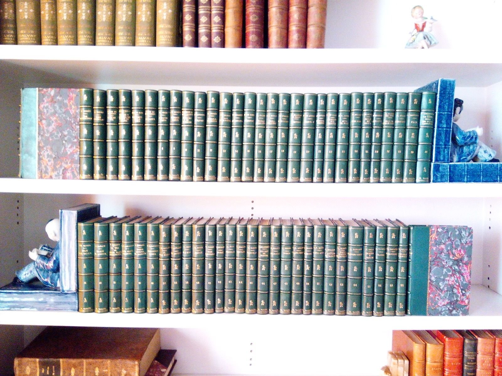 Madrid: Espasa-Calpe, 1929-1942.- 59 volúmenes de una media de 280 p.: retrato en cada volumen del personaje biografiado más alguna ilustración adicional entre texto en 26 de los 59 volúmenes; 8º (20 cm); Media Piel Chagrén Nueva de fina ejecución, lomo con cuatro nervios, cadenetas y florones dorados, conservando las cubiertas originales.- (Col. Vidas Españolas e Hispanoamericanas del siglo XIX).* Descripción precisa de los defectos: Algunos ejemplares están ligeramente moteados de óxido en mayor o menor medida (Nos. 3, 9, 11, 15, 17, 31, 32, 53, 55, 59). Hay ejemplares con las cubiertas y primeras hojas algo ajadas (Nos.10, 20, 30, 34, 50) e incluso con alguna rajita (Nos. 19, 36). Ejemplares con sellos adheridos en hoja de cortesía o anteportada o cubierta posterior (Nos. 24, 34,43, 46, 56). Ejemplares con sello tampón (Nº 17 en portada y Nº 34 en cabeza del primer capítulo). El ejemplar Nº 51 lleva firma a tinta en portada. Pero a pesar de lo descrito, que es preceptivo, los libros de esta colección completa han sido cuidadosamente encuadernados, por lo que ofrecen un aspecto magnífico, elegante e impecable. LITERATURA Y FILOSOFÍA ESPAÑOLAS DE LOS SIGLOS XIX-XXI Y SU HISTORIA EN GENERAL