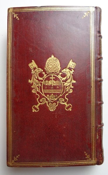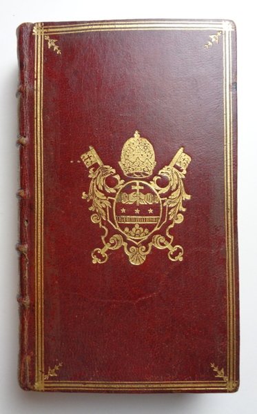 Due opere in un volume (10x17,5 cm) di (4)-400 per la prima opera, e XVI-147 per la seconda, pubblicata da Lottin e Musier nel 1761, con sottotitolo .; Extraites du recueil des historiens contemporains de sa vie, imprime par les soins de MM. de la biblioteque du Roi en 1761. Legatura francese in tutto marocchino rosso scuro, triplice filetto dorato a inquadrare i piatti; stemma dorato di CLEMENTE XIV ai due piatti; labbra con fregi; dorso a nervi ornato e dorato con tassello di titolo; tagli dorati; risguardie con carta marmorizzata. Ottime condizioni. Esposto alla Mostra La rilegatura d'arte antica pontificia (Museo civico di Albano, 1988).