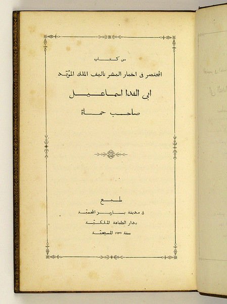 8vo. 2 parts in one volume. X, 160 pp. (4), 120 pp. Contemporary blindstamped calf, sparsely gilt. Marbled endpapers. Stored in custom-made full calf clamshell case. Only printed edition of this medieval biography of the Prophet, from the author's great historical work, the "Concise History of Humanity" ("Mukhtasar tarikh al-bashar"). Abu'l-Fida, born in Damascus in 1273, was a historian, geographer, military leader, and sultan. The crater Abulfeda on the Moon is named after him. - Includes an annotated French translation by Adolphe Noël des Vergers (1805-67). Binding slightly chafed; lower joint repaired. Slight foxing near beginning and end with occasional browning. A very appealingly bound set. - GAL II, 45. Chauvin XI, 2. Gay 3614. Silvestre de Sacy 1489. Hoefer XXXVIII, 184. Brunet I, 18. Graesse I, 8.