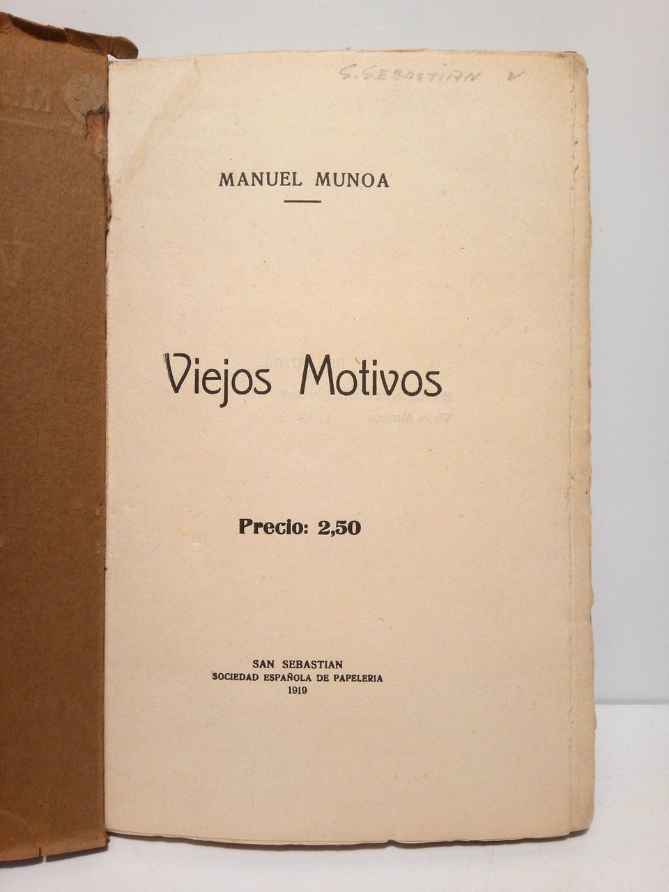 [PRIMERA EDICION].- San Sebastián: Soc. Española de Papelería, 1919.- 98 p.; 8º (19 x 13 cm); Cartulina Ed.* Cubiertas fatigadas. En el ángulo superior interno de la portada tiene un pequeño injerto de papel muy bien hecho. La última hoja en blanco, falta de un trozo en su esquina inferior externa. Por lo demás en buen estado. Manuel Munoa León fue un poeta guipuzcoano, natural de San Sebastián. Colaboró en las revistas, Euskal Erria desde 1902, Hermes, Vida Vasca, El Noticiero Bilbaíno, El Pueblo Vasco, El Sol y La Esfera. Escribió libros de poesía como, "Esculturas de Nieblas (1911), Poemas en luz, Primeros brotes, Viejos motivos, Cantos del infinito, Lirismo en espuma y El Velo de la diafanidad (1947)". Se le considera escritor de una poesía clara, sincera, de transparencia cristalina. Murió en San Sebastián en 1947. LITERATURA Y FILOSOFÍA ESPAÑOLAS DE LOS SIGLOS XIX-XXI Y SU HISTORIA EN GENERAL