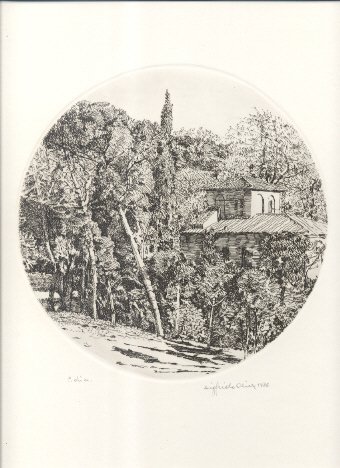 Acquaforte su lastra di zinco, di forma circolare con diametro di cm. 19,5, su foglio di cm. 50 x 35. Firma in basso a destra.