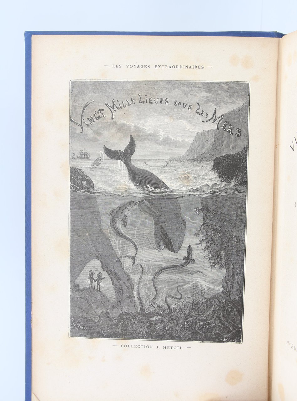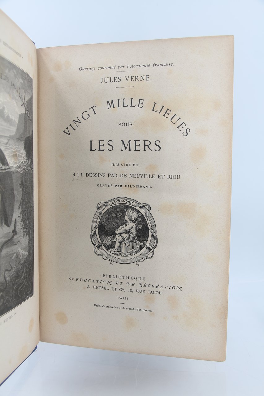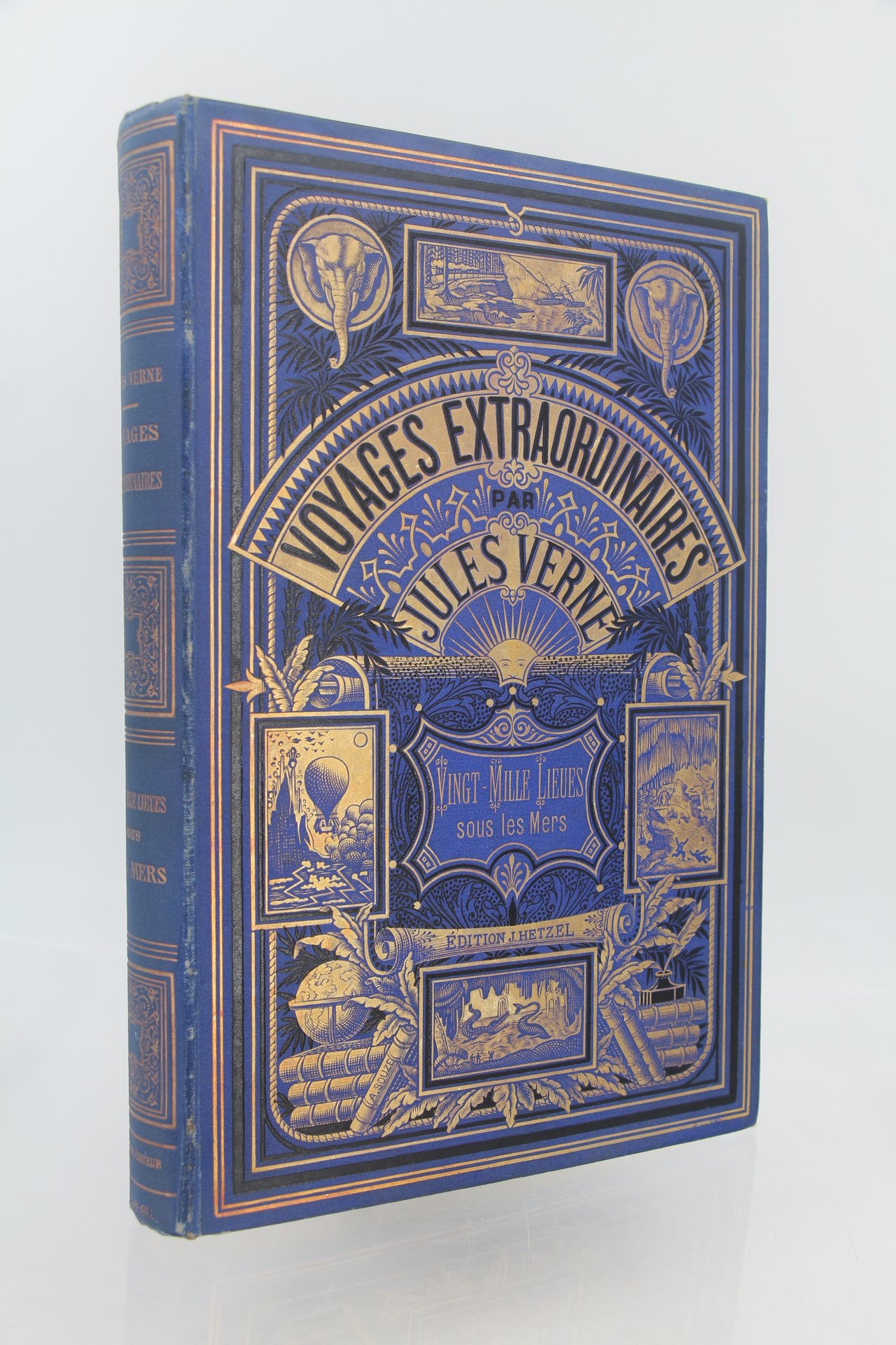 J. Hetzel & Cie | Paris 1882 (s.d) | 18 x 27.80 cm | reliure de l'éditeur | [ENGLISH DESCRIPTION ON DEMAND] | Edition illustrée de 11 dessins par De Neuville et Riou gravés par Hildebrand. En fin de volume, notre exemplaire est bien complet du rare catalogue du Magasin d'éducation et de récréation Cartonnage d'éditeur aux deux éléphants à la rare couleur bleu roi et de type Lenègre 1, plaque signée Souze, inscription dorée en queue du dos A.Lenègre Rel., ainsi qu'à froid en angle inférieur gauche du second plat inférieur avec une étoile, toutes tranches dorées, gardes de papier bleu, coins très légèrement émoussés, second plat de type Lenègre b qui comporte des taches de décoloration. Quelques traces de frottements sur les mors, coiffes affaissées comme généralement, quelques rousseurs affectant principalement les tous premiers et tous derniers feuillets. Rare et agréable exemplaire présenté dans un cartonnage bleu peu commun.