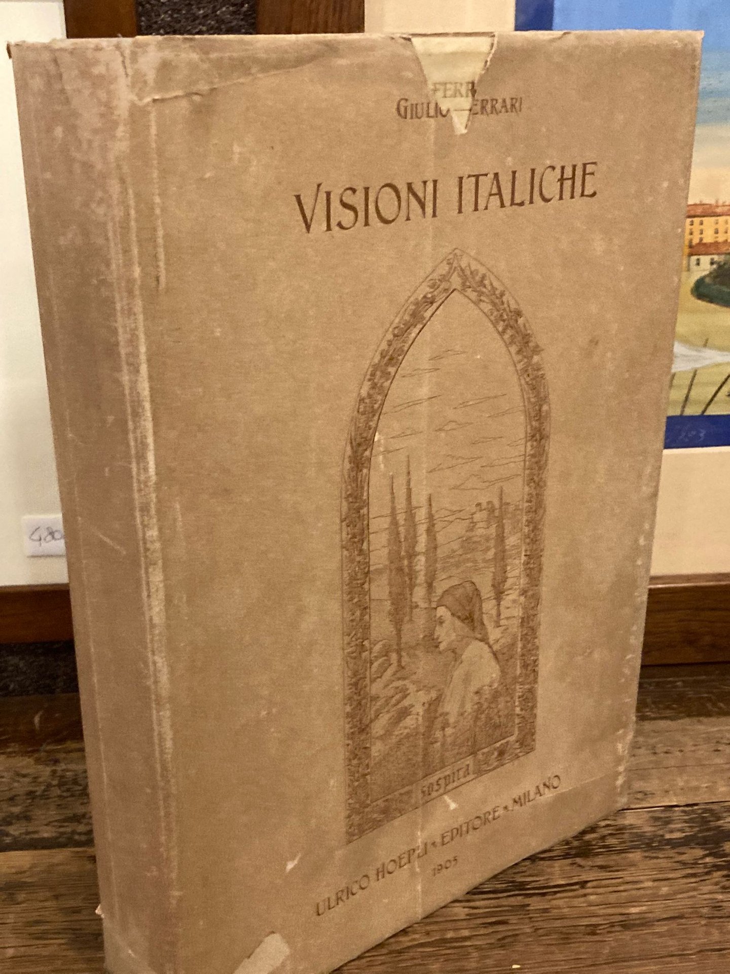 In-4° (30x22 cm), pp. XXXV (1), 272 (2), cartonatura editroiale rigida avorio con titoli in nero al dorso e dorati rubricati in rosso al piatto anteriore entro cartiglio, sovracoperta figurata. 310 illustrazioni nel testo b/n o virate rosso e sanguigna; testate, finali, capolèttere; 43 tavole fuori testo protette da velina. Mancanze alla sovracoperta. Interno molto fresco. Più che buon esemplare. Edizione originale di questa rievocazione di alcuni luoghi amenissimi italiani ma ignoti ai più del Centro Italia, del Gargano, Roma, Milano e dintorni, Sicilia, etc. Di grande interesse l' apparato iconografico originale soprattutto le fotocalcografie riproducenti opere originali dell' autore e gli ornati paratestuali art nouveau.