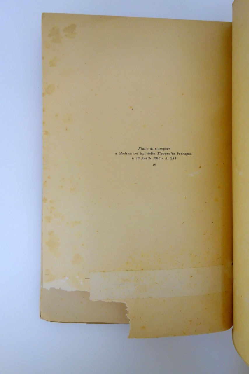 Tip. Ferraguti, Modena, 1942, cm.15,5x23,5, pp. 148 con alcune tavv. in b/n fuori t.; brossura ed. con titoli al piatto e al dorso. All'antiporta firma autografa dell'autore, il Benvenuti.