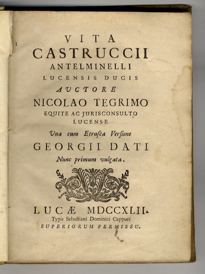 Vita Castruccii Antelminelli Lucensis ducis auctore Nicolao Tegrimo equite ac iurisconsulto Lucense una cum etrusca versione Georgii Dati nunc primum vulgata. | Libri antichi e moderni | Tegrimi Niccolò.