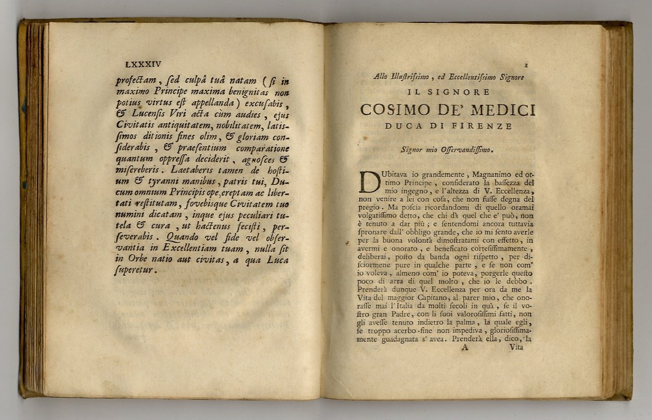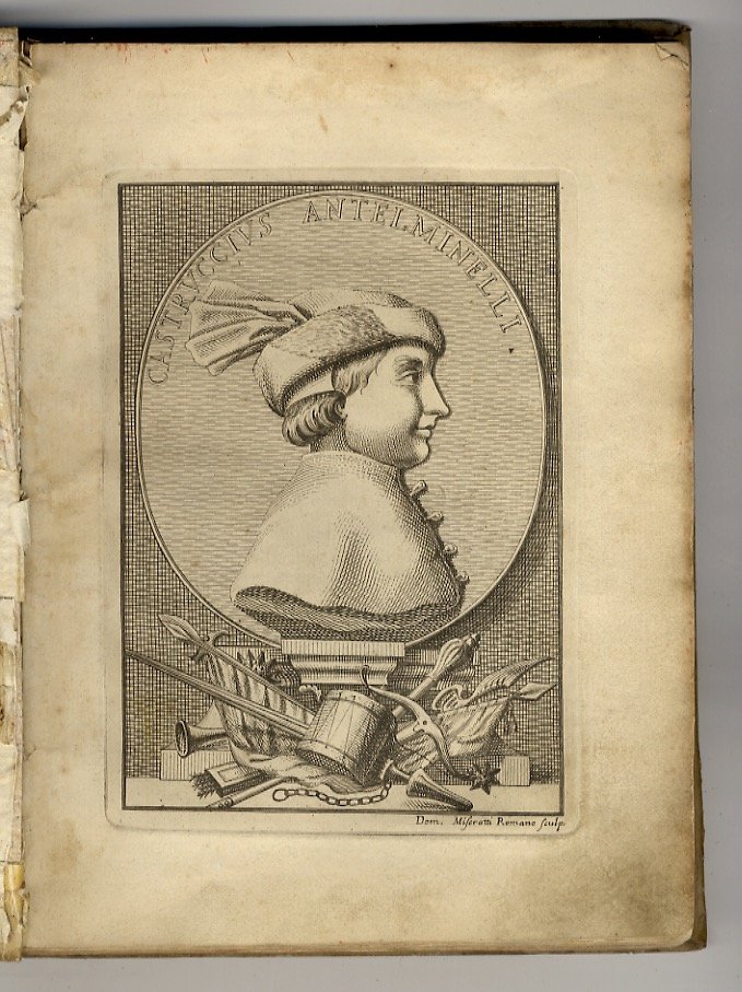 Lucae, typis Sebastiani Dominici Cappuri, 1742, in-4, legatura coeva in piena pergamena, pp. [4], LXXXIV, 164. Con ritratto di Castruccio Antelminelli inciso in rame da Domenico Miserotti Romano in antiporta. Testo latino con traduzione in lingua italiana. Traccia di tarlo all'angolo superiore interno delle prime 10 carte, manca la prima carta di guardia, per il resto buon esemplare.