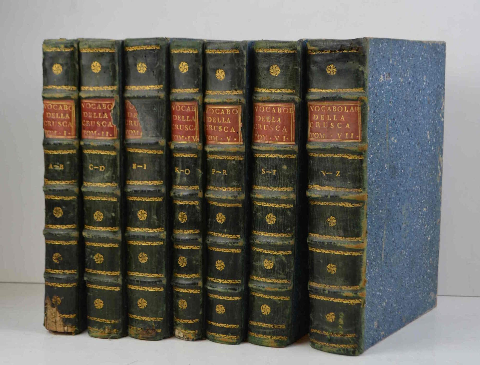 Sette volumi di cm. 28, pp. 3.000 ca. complessive. Marchio tipografico in xilografia a ciascun frontespizio. Solida ed elegante legatura coeva in mezza pelle, dorsi a nervi con fregi in oro e titoli su tasselli in marocchino rosso. Testo su tre colonne. Esemplare genuino e ben conservato on solo qualche segno d'uso ai dorsi ed una mancanza parziale ad un tassello. In fine al settimo ed ultimo volume sono presenti le seguenti appendici e testi: "Sopraggiunta di voci e modi di dire..."; Unito a: Indice delle voci, e locuzioni latine. Pp. 237. Unito a: Autori o libri d'autori del buon secolo. Libri di certo autore. Pp. 72; Unito a: BALDINUCCI F. Vocabolario toscano dell'arte del disegno... Verona, Ramazzini, 1806. Pp. viii, 85 (1). Unito a: PASTA ANDREA. Voci e maniere di dire e osservazioni di toscani scrittori e per la maggior parte del Redi... Verona, Ramazzini, 1806. Pp. ix (1) 165 (1).