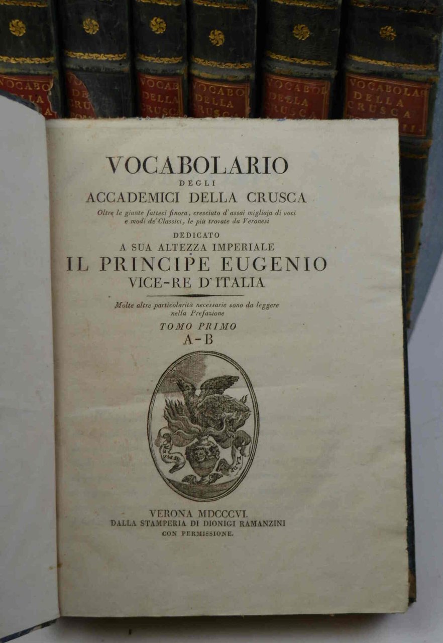 Vocabolario degli Accademici della Crusca oltre le giunte fatteci finora, cresciuto d'assai migliaja di voci e medi de' Classici, le più trovate da Veronesi dedicato a Sua Altezza Imperiale il Principe Eugenio Vice-Re d'Italia… | Libri antichi e moderni |